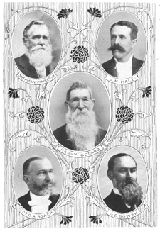 Center inset: Harvy Godard, First Master of the First Connecticut State Grange; Clockwise from top left: Sherman Kimberly, Second and last Master of the First State Grange and First Master of the Second State Grange; J.H. Hale, Second State Master; Dr. G.A. Bowen, Third State Master; S.O. Bowen, Fourth