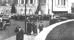 (Top) "ON THEIR WAY TO BUSHNELL MEMORIAL HALL to receive the Seventh Degree after registering at the State Capitol, Saturday morning, Nov. 17."