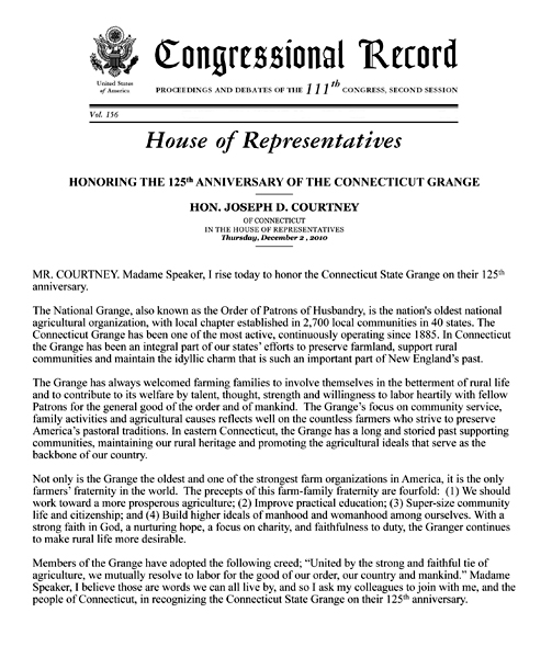 The Connecticut State Grange has been formally recognized in the Congressional Record by U.S. Rep. Joe Courtney, D-CT, calling the organization "an integral part of our states’ efforts to preserve farmland, support rural communities and maintain the idyllic charm that is such an important part of New England’s past."