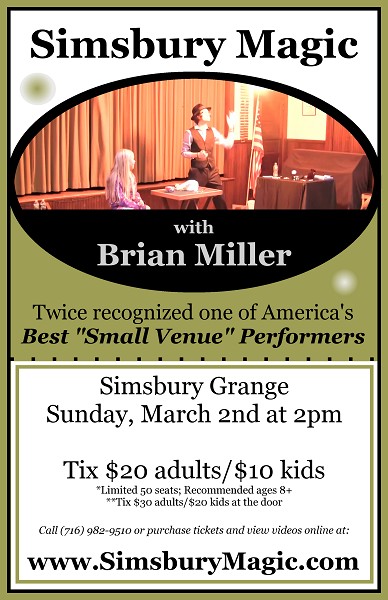 Simsbury Grange is hosting the Brian Miller Magic Show on Sunday, March 2nd at 2:00 PM at the Grange Hall. The show should last approximately 60-75 minutes in length. Following the show, a 30 minute group magic lesson with Brian will be offered to children. Simsbury Grange Hall is located at 236 Farms Village Road (Rt. 309), West Simsbury.