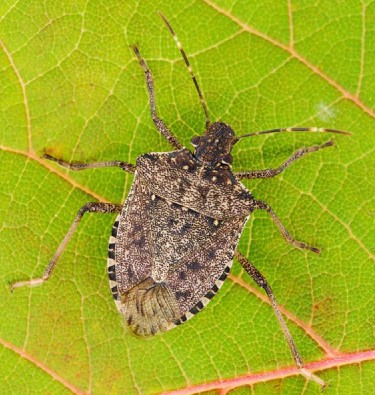 Of Asian origin, the adult insect is less than three-quarters of an inch, a reported pest of a wide range of fruits and vegetables, such as corn, tomato, pepper, peach, nectarine, apple, pear, soybean, and red raspberry. The insect is widely distributed in eastern United States, particularly the mid-Atlantic region. The white bands on the antennae distinguish this pest from other northeastern stink bugs that are not as economically important. The bugs, which are not beetles, will seek shelter in homes and other buildings during the fall and can be a nuisance, but they do not bite or sting people. However, if disturbed, they will release a liquid which creates a pungent odor.